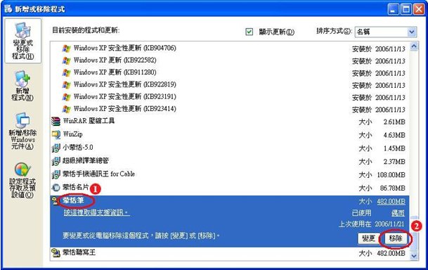 步驟3:如果要移除任一個已安裝的軟體,請先點選該軟體名稱,再點選【移除】按鈕,例如:先前選【蒙恬筆】字樣,再點選【移除】按鈕,即進行移除動作,如下圖所示。